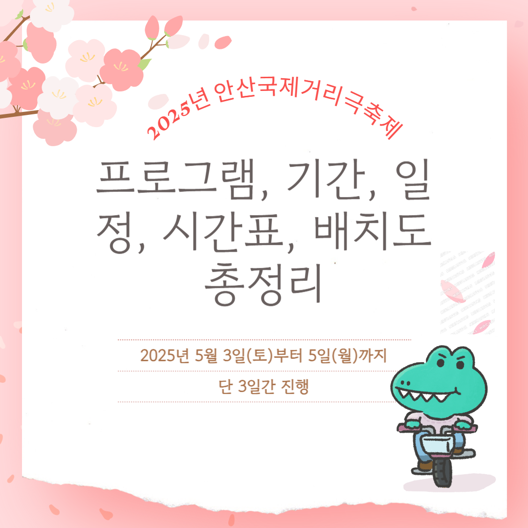 2025 안산국제거리극축제는 예술과 일상이 만나는 특별한 시간입니다. 축제 프로그램, 기간, 시간표, 일정, 그리고 배치도 정보를 미리 숙지하고 준비한다면 더욱 알차게 축제를 즐길 수 있습니다. 올해도 안산에서 펼쳐질 멋진 예술의 향연을 절대 놓치지 마세요!